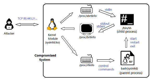 - User-Space Binary (sysinitd): Disguised as a legitimate process, this component handles communication between the kernel module and the attacker.
