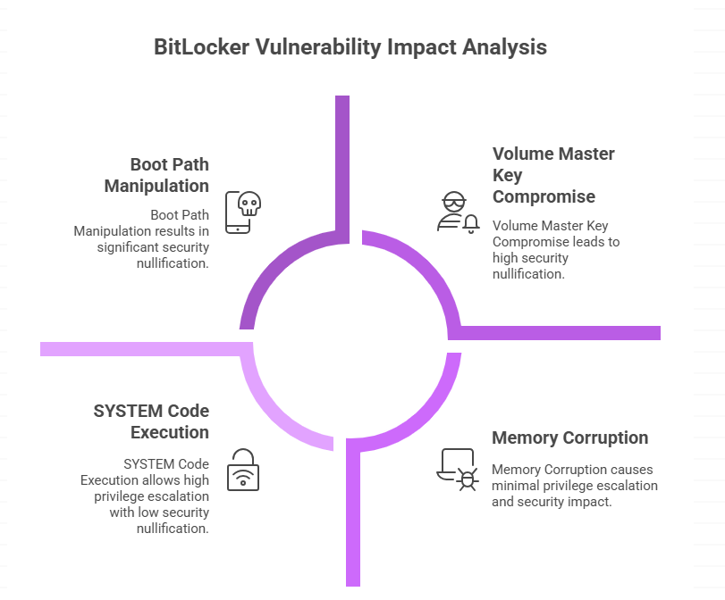 At a high level, an attacker who can run code on a machine or who has physical access can sometimes chain a BitLocker flaw into a local privilege escalation. For example, a memory corruption in the BitLocker component could let an authenticated low privilege user execute code as SYSTEM. That means a user account that normally cannot read other users’ files might become an all powerful local admin.